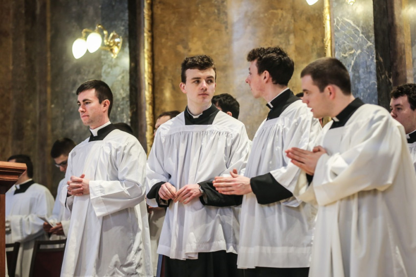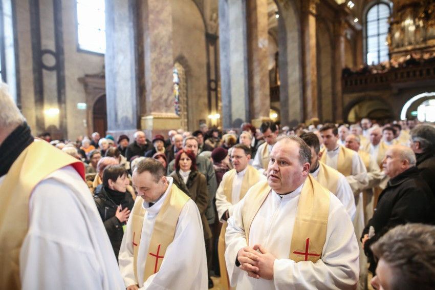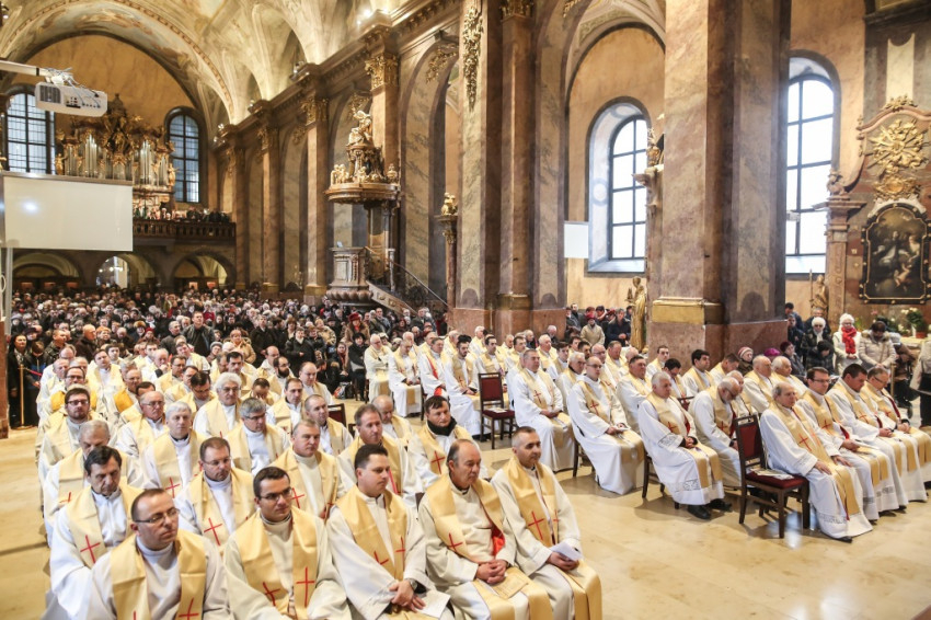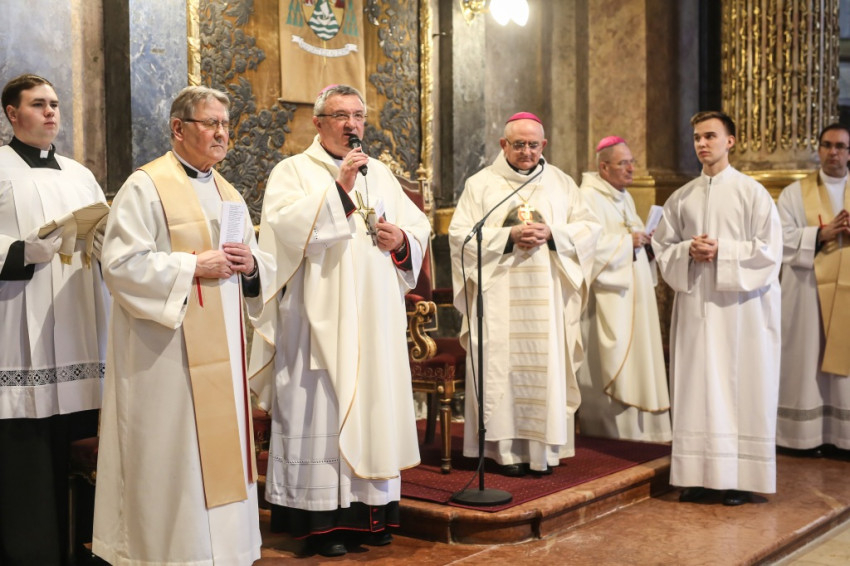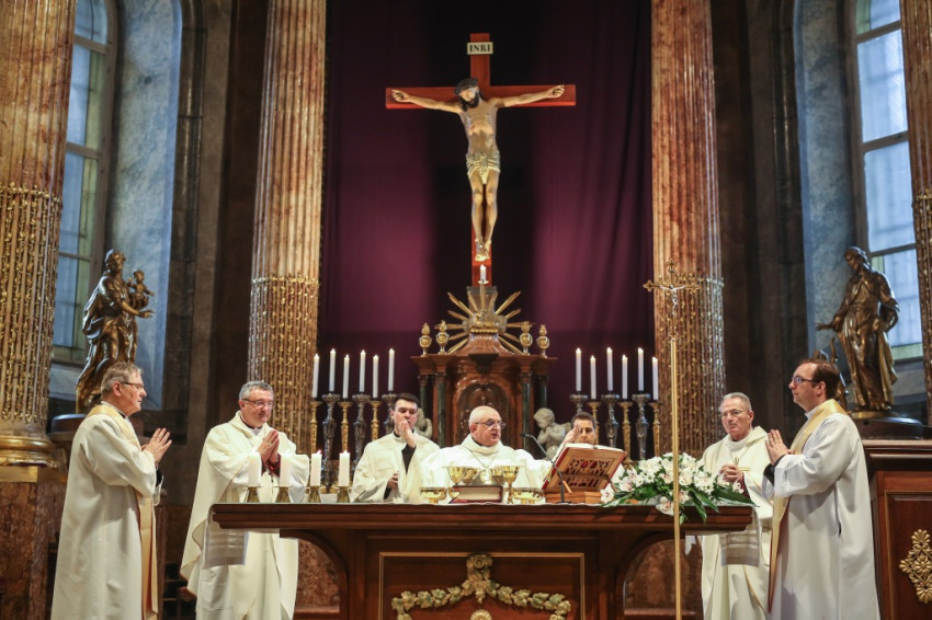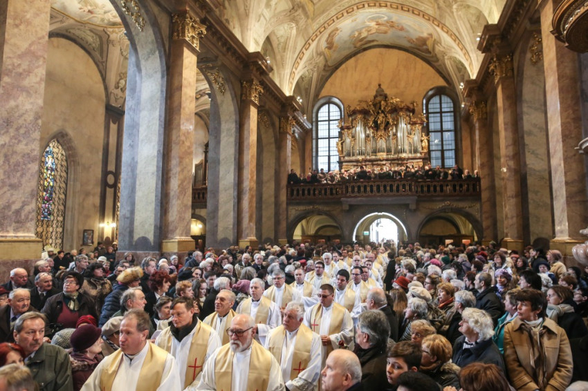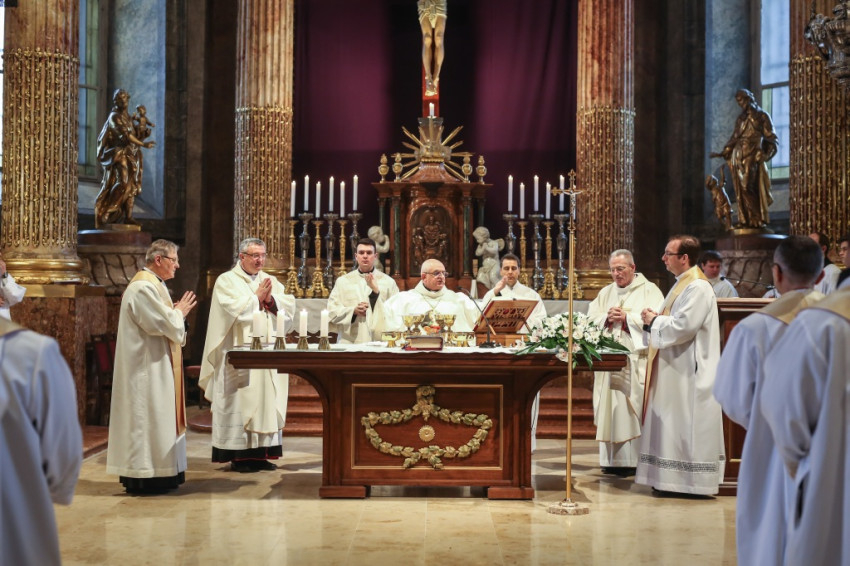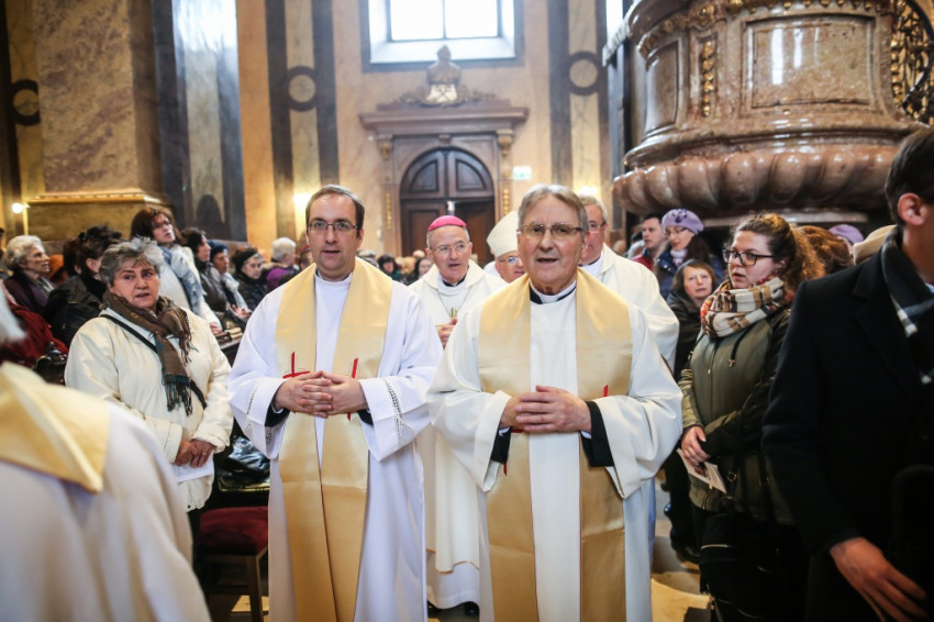 A szentmisére hívek sokasága töltötte meg a székesegyházat. Az atyák a szentély előtt elhelyezett széksorokban ültek, a szentélyben kaptak helyet a növendékek és az írországi vendégek, a Saint Patrick’s College tizenegy növendéke és elöljáróik. Az oltár körül állt Varga László főcelebráns mellett Veres András győri megyéspüspök és Pápai Lajos nyugalmazott győri megyéspüspök, Németh László helynök és Bognár István, a székesegyház plébánosa. Veres András így köszöntötte az egybegyűlteket: „Bánatunkat, örömünket, hálaadásunkat hoztuk ma ide, a Szűzanya elé.”