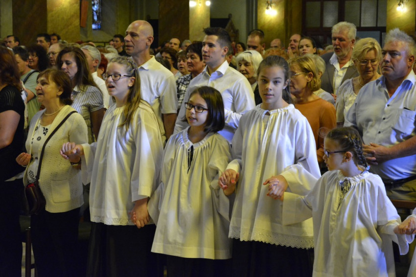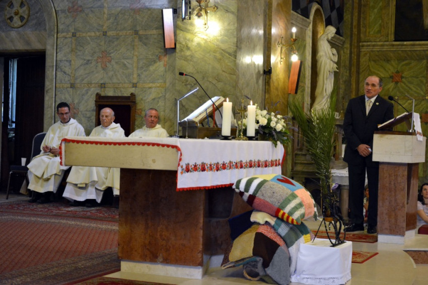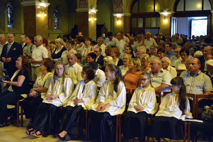 A főcelebráns, a koncelebráló papok és az asszisztencia a templomon végigvonulva érkeztek az oltárhoz. Ott a hatvanöt esztendővel ezelőtt pappá szentelt Lajos atyát először a képviselő-testület világi elnöke, Veres Zoltán köszöntötte. Szeretettel hívta fel a megjelentek figyelmét arra, hogy a főpásztor, Erdő Péter bíboros épp ezen a napon ünnepli születésnapját. Mondatait taps követte.