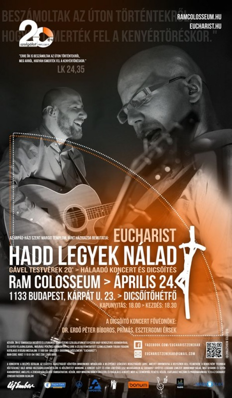 – Az Eucharist együttes április 24-én Budapesten, a Kárpát utcában, az Árpád-házi Szent Margit-templom felajánlására, a RaM Művelődési Központban tart hálaadó koncertet és dicsőítést, amelynek fővédnöke Erdő Péter bíboros, prímás. A mottó – „Hadd legyek Nálad” – Loyolai Szent Ignác „Krisztus lelke, szentelj meg engem” kezdetű imájára emlékeztet…