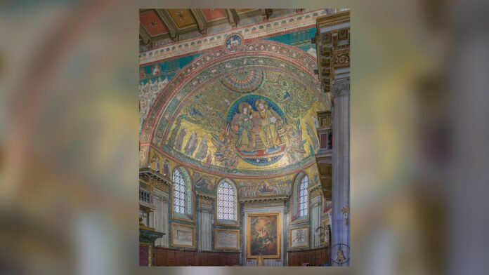 A Santa Maria Maggiore-bazilika apszismozaikja a templom hosszanti hajójának végződésében helyezkedik el. A bizánci mozaik Szűz Mária életének jeleneteit ábrázolja; részletgazdagságát a fő jelenet körül ábrázolt szentek fokozzák. Közöttük felismerhetőek: Péter és Pál apostolok, Assisi Szent Ferenc, Keresztelő Szent János, Szent János evangélista és Páduai Szent Antal is.