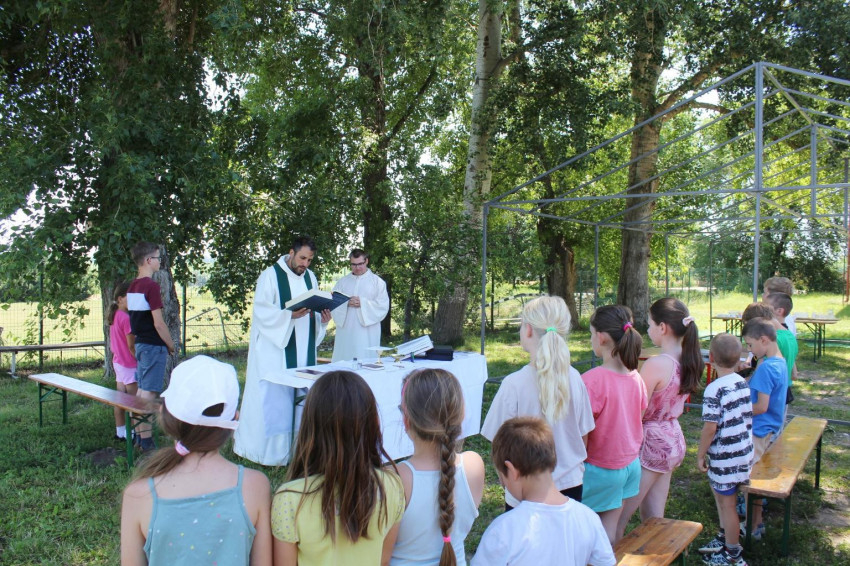 A táborban jelen volt és foglalkozásokat is vezetett Kovács Gábor negyedéves papnövendék, aki nyári gyakorlatát töltötte a győri karitászközpontban, Író Sándor plébános pedig szentmisét mutatott be a tábori helyszínen.