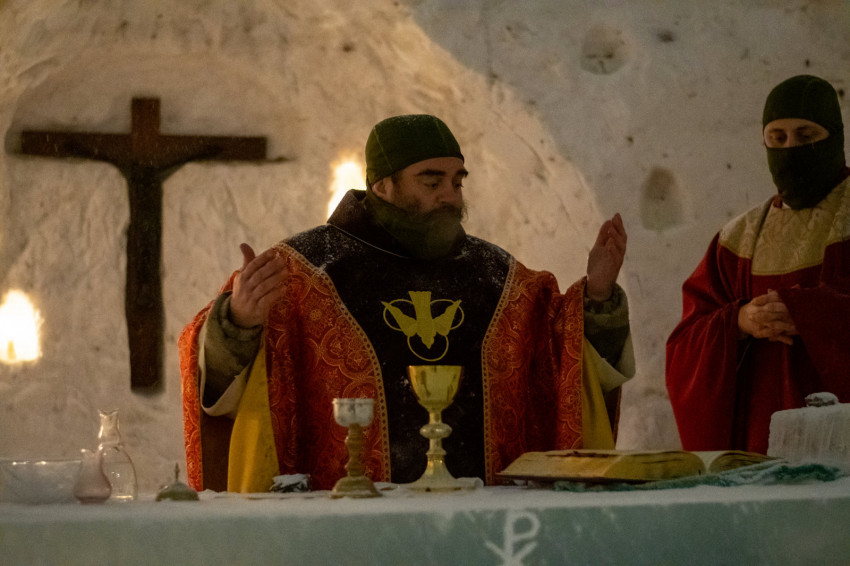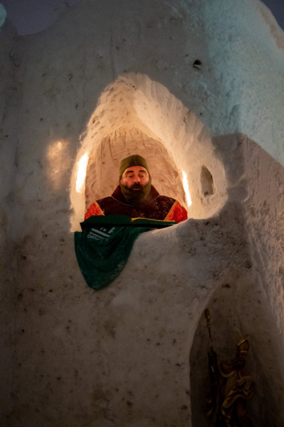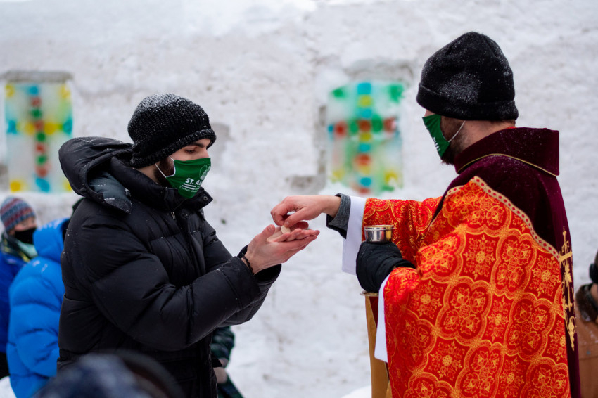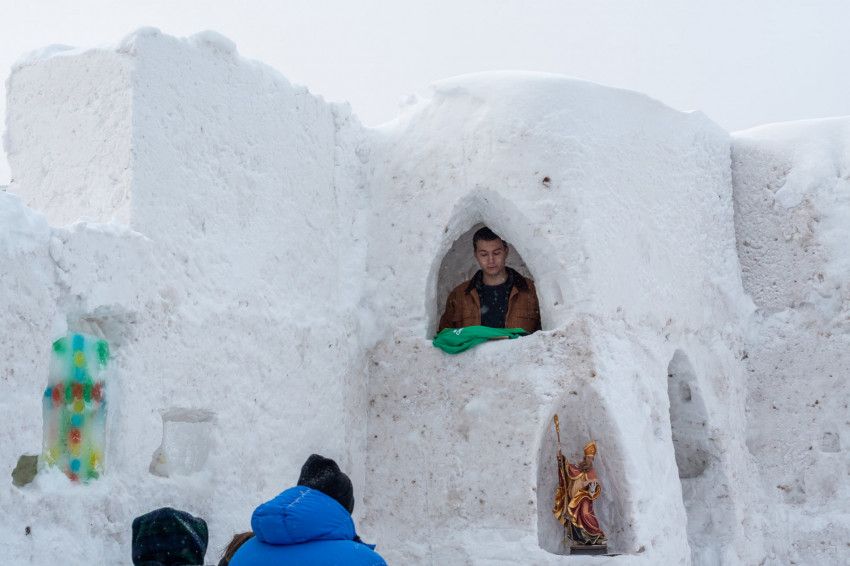 Idén a járvány miatt még hasznos is a jégkápolna, nem csupán hangulatos: a felülről nyitott építményben a Covid-19-járvány kapcsán hozott rendelkezésekkel összhangban lehet részt venni szentmisén.