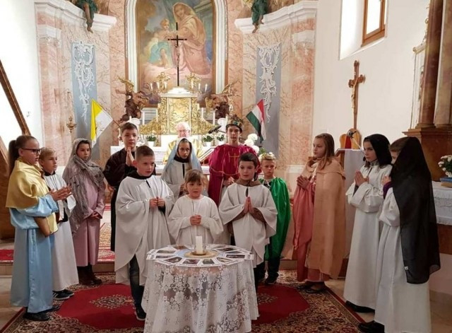 A mocsai Rózsafüzér Királynéja-templomban tartott rendhagyó eseményre a mindenszentek-napi ünnepi szentmisét követően került sor. A helyi gyermekek és fiatalok szentek életéről és példamutatásáról emlékeztek meg Példaképeink, a szentek című jelmezes műsorukban.