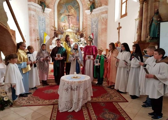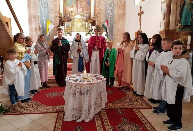 A játékos bemutató mellett vetített képekkel is illusztrálták az adott szent életét. A műsort a szentekhez szóló közös imádság, majd gyertyagyújtás zárta, végezetül pedig elénekleték az „Isten, hazánkért térdelünk elődbe” kezdetű éneket. „Megható volt átélni, ahogy az ének felcsendülésekor a hívek örömükben állva csatlakoztak az énekléshez, mint egy nagy közös könyörgéshez , megköszönve ezzel a gyermekek szép előadását” – számolt be az eseményről a helyi közösség egy tagja.