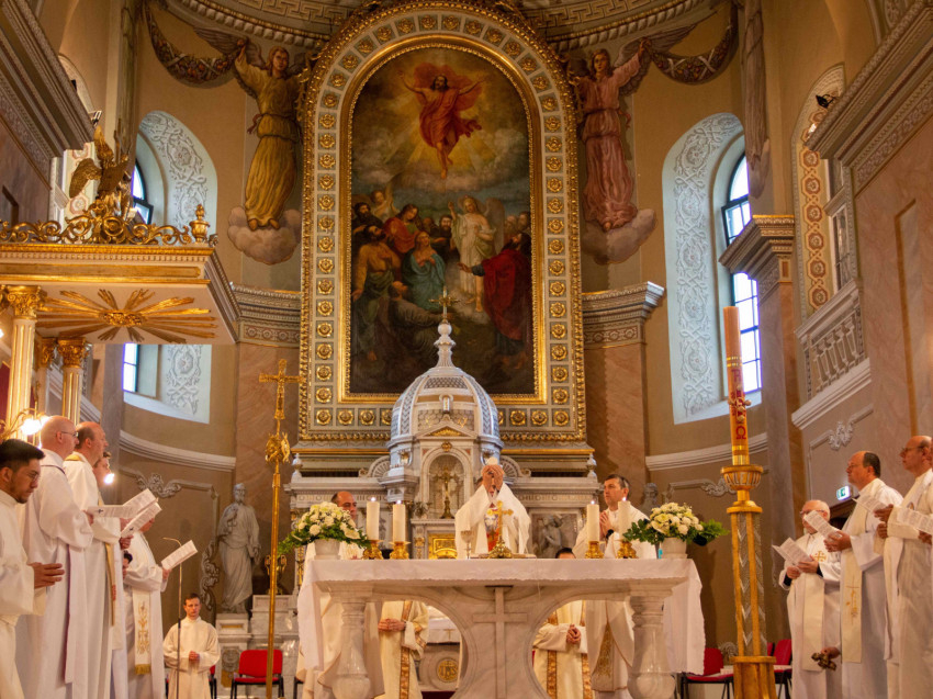 Az evangélista nem említi meg a mennybemenetel szemtanújaként Szűz Máriát és nem beszél az Urat követő asszonyokról sem. Mégis ügyes írói és teológiai motívumok használatával az események középpontjába állítja az Isten Anyját – emelte ki a szónok. – A székesegyház oltárképén, a Pesky József által készített festmény közepén is a Szűzanya áll mint az első Krisztus-hordozó, megjelenítve az Egyházat és az összes Krisztus-hívőt. Ugyanakkor Mária mellett megfigyelhetők a fehér ruhába öltözött, angyalszárnyú férfiak is, a mennybe felmenő Krisztus piros ruhája pedig az emberi természetet is szimbolizálja. Mindez rávilágít arra, hogy a megtestesülés és a megdicsőülés titkát együtt kell szemlélni.