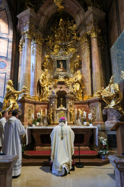 A szentmise végén a koncelebráló papok és a hívek Veres András püspök vezetésével a Könnyező Szűzanya kegyoltára előtt imádkoztak.