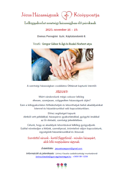 Jelentkezni, illetve érdeklődni a +36-30-0913258-as telefonszámon, illetve a jezusakozeppont@gmail.com és a lorincz.klaudia@gyor.egyhazmegye.hu e-mail-címeken lehetséges.