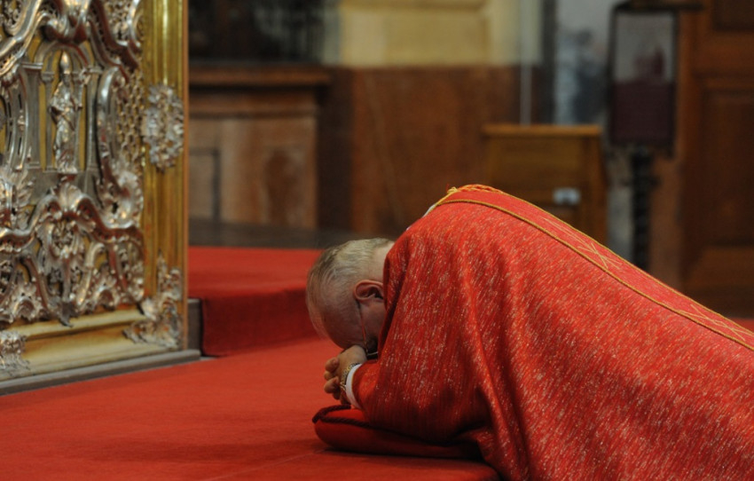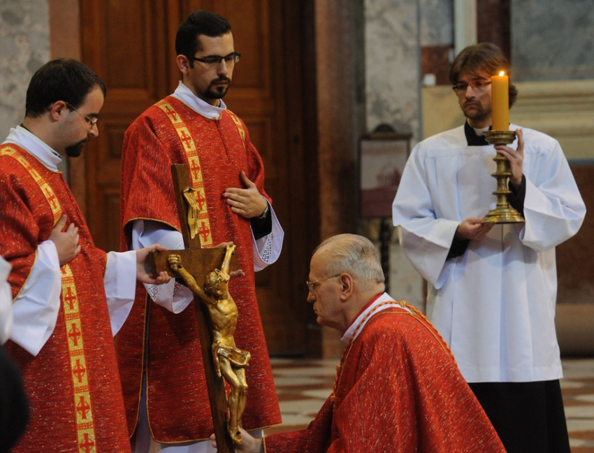 Nagypénteken az egyház nem mutat be szentmiseáldozatot, az úgynevezett csonka mise szertartásával fejezik ki a Krisztus halála felett érzett gyászt. Erdő Péter vezetésével az asszisztencia némán vonult az esztergomi bazilika üres oltára elé, ahol a főpásztor leborulva, csendben imádkozott.