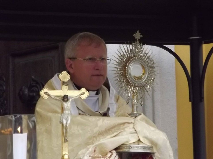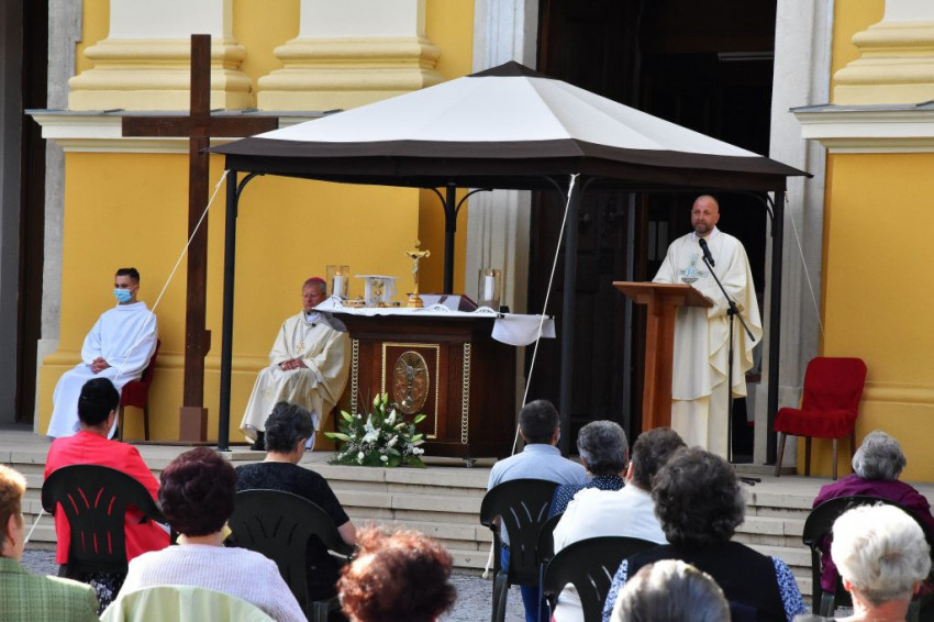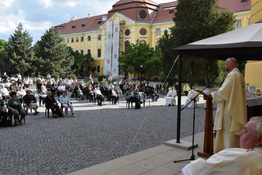 Már az Ószövetségben találunk útmutatásokat arról, mit jelent az „Emeljük fel szívünket!” – magyarázta a szónok. A pusztai vándorlások során Mózes kétszer üt a sziklára, hogy víz fakadjon, a katona lándzsája pedig megnyitja Jézus szívét, hiszen Krisztus a szikla. Mi pedig itt, a jelenben, az egyházmegye szívében hittel és bizalommal tekintünk Szent Lászlóra. Mint ahogy a pusztában Mózes botja, vagy mint László királyunk bárdja nyomán víz fakad, úgy a hit élő forrása fakad Krisztusból. Törekvő hittel igyekszünk szívünkkel tehát Jézus Szívéhez emelkedni, melynek lényege nem más, mint az Eucharisztia. Ha jönnek a megpróbáltatások, vészjósló hírek, nem kell aggódnunk vagy félnünk, mert a gyökereink a folyóig jutnak el a szentáldozás során, ugyanis az Oltáriszentség megmutatja, milyen Jézus belülről.