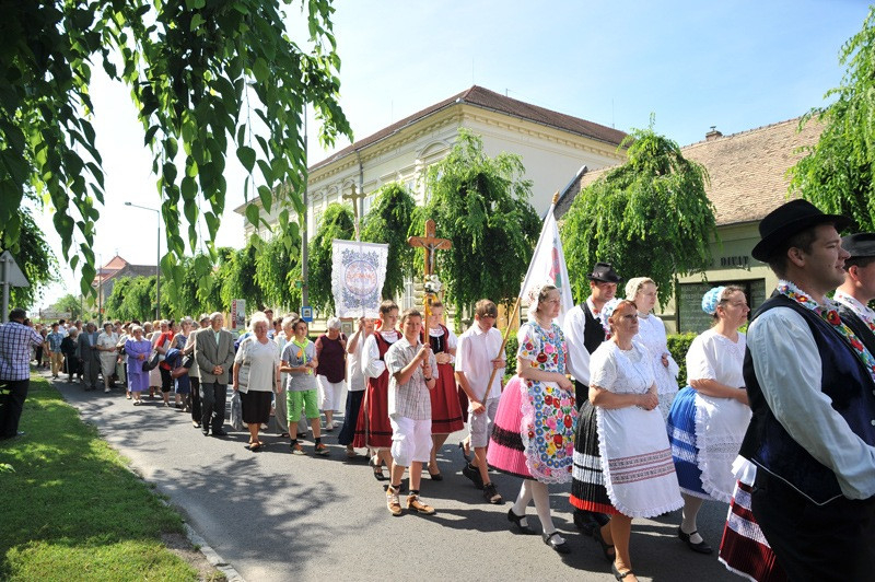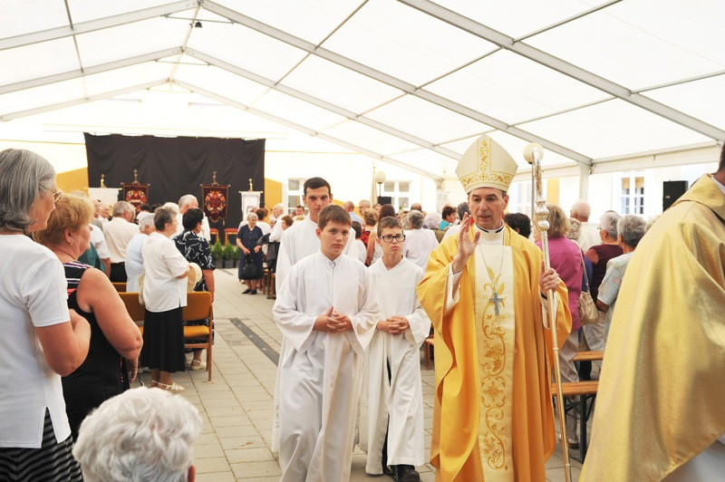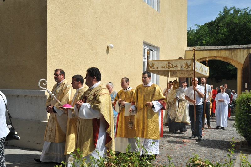 A vasárnapi főbúcsún kora reggeltől vehettek részt szentmiséken a zarándokok és a helyi hívek. Az ünnepi szentmise szentségi körmenettel kezdődött. A kalocsai népviseletbe öltözött gyermekek az Oltáriszentség előtt virágszirmot hullatva vonultak az éneklő zarándokokkal együtt a Tomori Pál Főiskola udvarán felállított szabadtéri oltárhoz, ahol az ünnepi szentmisét Udvardy György pécsi megyéspüspök mutatta be.