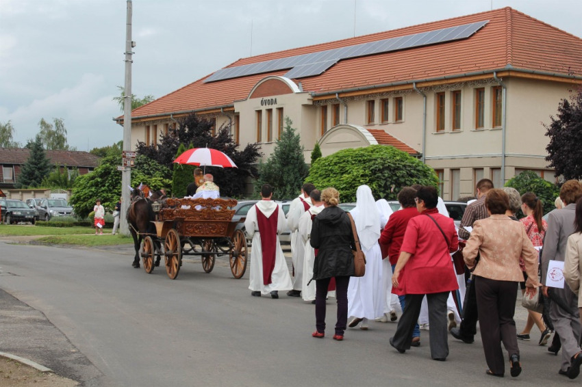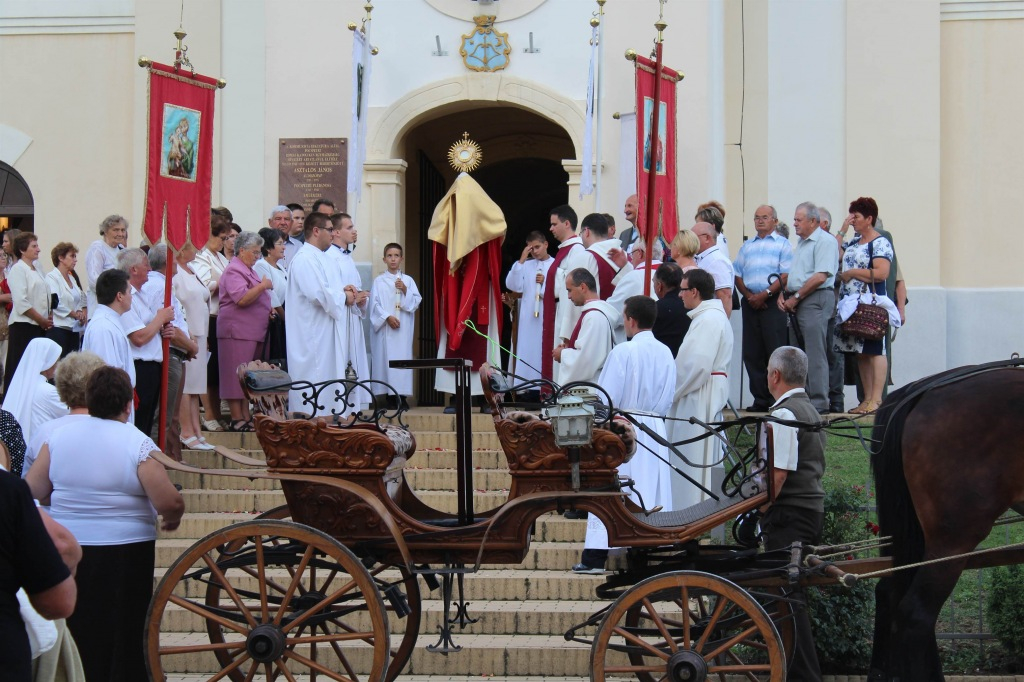 A nap zarándoklattal kezdődött, amely során díszes, faragott hintóval hozták át az Oltáriszentséget Máriapócsról. A hintót szerzetes testvérek és nővérek követték a hívekkel együtt gyalog, a gyermekek és idősek pedig lovas kocsikon, zászlókat lengetve. Az úton a Vianney Testvérek a Tisztuló Lelkekért Közösség szerzetesei vezették az imát, a Szent Kamill Leányai Szerzetesközösség nővérei az éneklést.