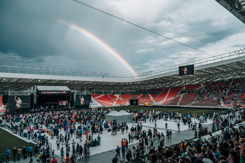 Ha tavaly a hőség, akkor idén a lehetséges zivatarok miatt lehetett aggódni, főleg, hogy előző este befolyt a víz a stadionba. Ám ahogyan tavaly a Puskásban is pár óra alatt 43-ról végül 25 fokra csökkent a koncertre a hőmérsékletre, itt is kegyesek voltak az égiek, mert csak enyhe eső érkezett, amit egy hatalmas szivárvány követett.