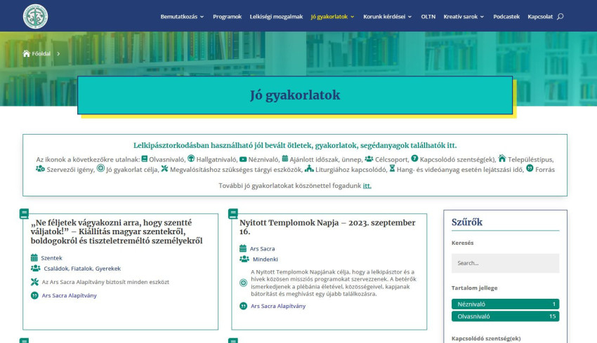 Jó gyakorlatok – a legnagyobb változás és újítás ez a menüpont a korábbi honlaphoz képest. Úgy képzeljük el az egészet, mint egy könyvespolcot. Először egy átlátható „polcrendszert” kellett kialakítani, ahol könnyen megtalálható a számunkra éppen aktuális „könyv” – magyarázza Fábry Kornél, az intézet igazgatója. – A könyv jelen esetben egy-egy jó gyakorlatot, ötletet jelent, amelyre különböző szempontokból lehet rákeresni az oldalsó menüsorban. A keresési szempontok: a tartalom jellege szerint lehet olvasni-, nézni- vagy hallgatnivaló; rá lehet „szűrni” kapcsolódó szentségre, ha a jó gyakorlat valamely szentséghez kötődik; a célcsoport, a településtípus (nagyvárosban vagy inkább kistelepülésen alkalmazható) és időszak (például advent) szerint is lehet keresni, valamint arra, hogy az adott gyakorlat liturgiához kapcsolódik-e. Több kategóriában egyszerre is lehet keresni, tehát ha fiataloknak keresünk adventi jó ötletet, akkor a célcsoportban megjelöljük a fiatalokat, az időszakban pedig az adventet, és így megkapjuk az összes adventi, fiataloknak szóló jó gyakorlatot. Az ötlet címére kattintva új oldalon részletes leírás található az esetleges letölthető anyagokkal együtt, hogy az is meg tudja valósítani, aki most szeretné először kipróbálni az adott ötletet.