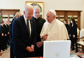 A Fehér Ház egyik feljegyzése szerint ezen a beszélgetésen Biden „köszönetet mondott a pápának, amiért szüntelenül azon munkálkodik, hogy enyhítse a globális szenvedést, beleértve ebbe az emberi jogok előmozdítása és a vallásszabadság védelme érdekében végzett munkáját”. Lényegében ugyanezek az okok vezették az amerikai vezetőt arra, hogy kitüntesse a pápát az érdemrenddel, amelyet egy héttel korábban már átadtak a politikai és művészvilág tizenkilenc olyan képviselőjének, akik „példamutatóan járultak hozzá az Egyesült Államok jólétéhez, értékeihez vagy biztonságához, a világbékéhez vagy más jelentős társadalmi, nyilvános vagy magánjellegű törekvésekhez”. Egyes megfigyelők már akkor megjegyezték, hogy a díjazottak száma nem a szokásos húsz volt; Biden nyilvánvalóan a római látogatására tartogatta a meglepetést.