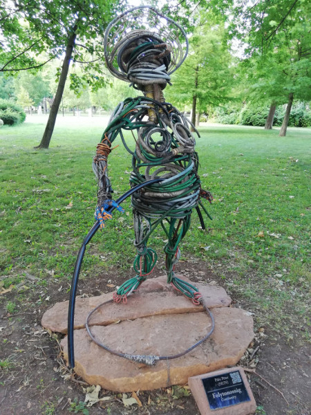 Az Alien című film óta tudjuk, milyen félelmetes lehet egy kábel, vagy több kábel, vagy tucatnyi gégecső. Hans Rudolf Giger, a fantasztikus svájci tervezőművész megmutatta ezt nekünk. Páhi Péter Folytonosság című elképesztő alkotásán meghökkentően sok kábel és gégecső tekeredik mindenfelé. Az egész alak kábelből, csövekből, drótokból van megkonstruálva. Ez a mű a kísérletező kedv netovábbja, legalábbis ezen a szabadtéri tárlaton. Mindenképpen vicces, milyen pökhendien áll ez a kis alak a park szegletében. Mindenesetre megközelítően sem olyan veszedelmes, mint Giger kábelszörnyei.