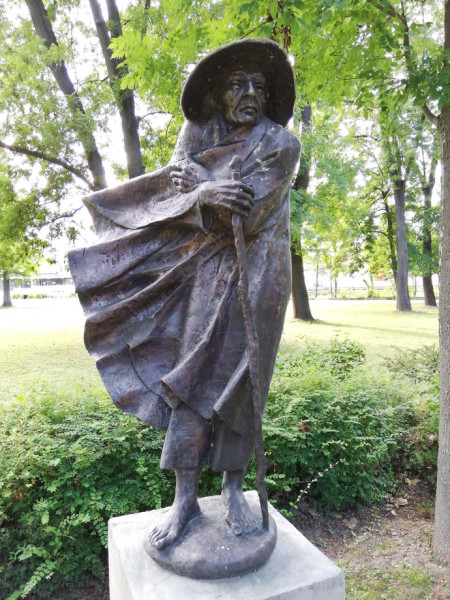 Farkas Ferenc Hokusai című bronza egészen más a maga realizmusával. A kis japán emberke fázósan húzza össze magát az erős szélben, vándorbotját épphogy megtartva.