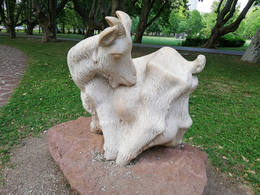 Rieger Tibor Kecskéje egyszerűen bájos; hosszú szőre beborítja a fejétől a talpáig. Anyaga, a fehér mészkő az idők során elefántcsont színre váltott.