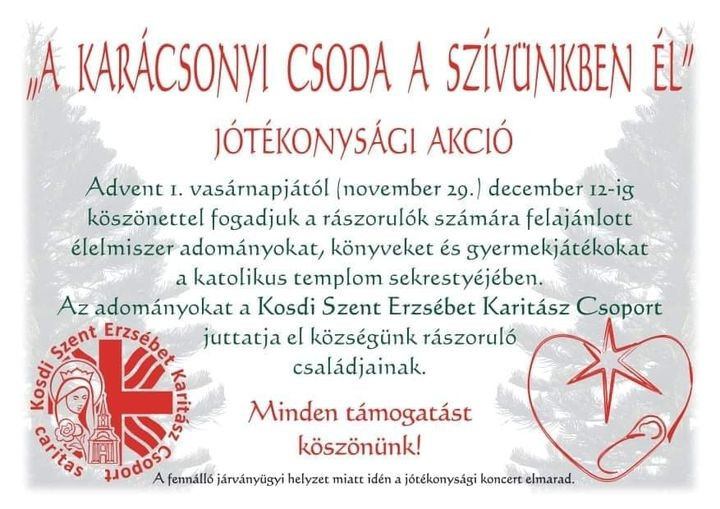 A szervezők minden támogatást megköszönnek. A rászoruló családoknak a helyi karitászcsoport juttatja majd el az adományokat.