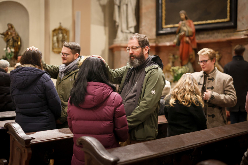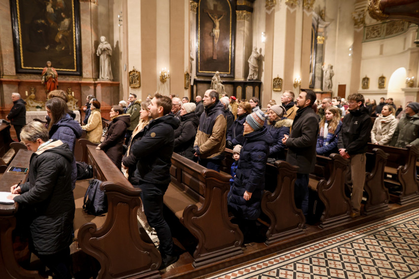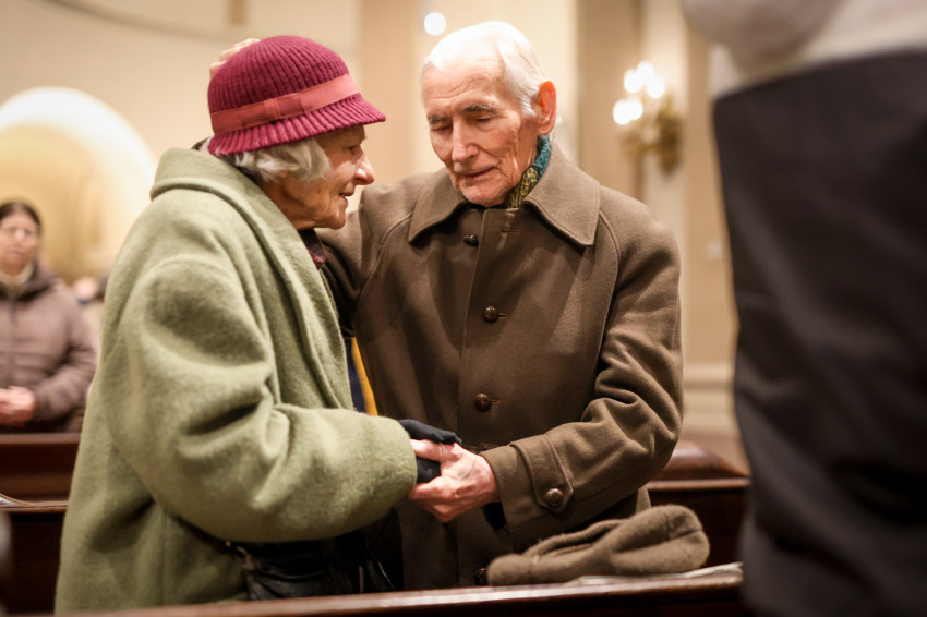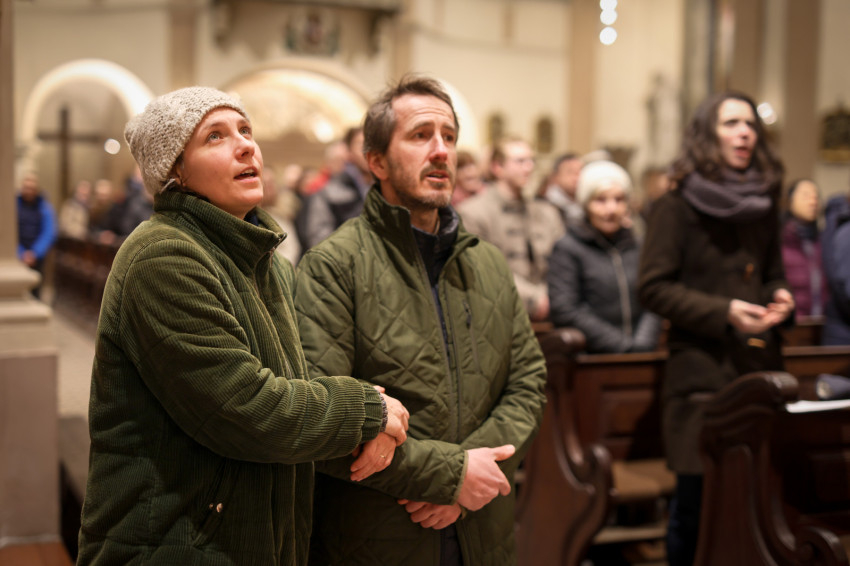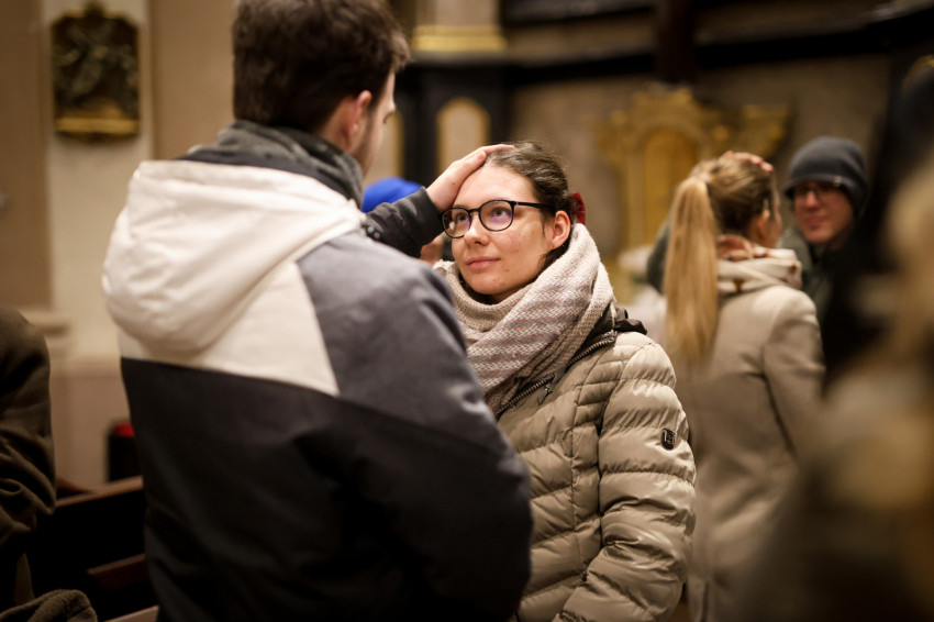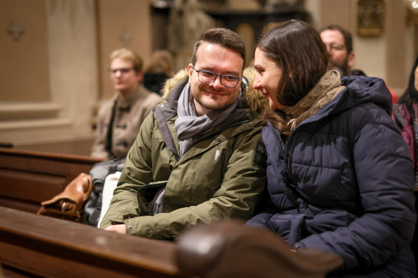Rozi és Bernát tiszta tekintetű, mosolygós szemű fiatal pár – öröm rájuk nézni, sugárzik róluk, hogy boldogok. Negyedik gyermeküket várván – két kislányuk és a kisfiuk után újra kislány érkezik a családba – külön szervezést igényelt, hogy időben elinduljanak és meg is érkezzenek. Kilenc éve ismerik egymást, házasságuk hetedik évében vannak. Abban a bizonyos, sokak szerint a párkapcsolatokban vízválasztónak számító, krízishelyzeteket hozó hetedik évben. „Harmadszor veszünk részt ezen a szentmisén. Ma azért is jöttünk el, hogy egy kicsit kettesben lehessünk és külön áldásban is részesüljünk, hogy így az előttünk álló esetleges nehézségeket könnyebben átvészelhessük – mondja Rozi. „Korábban is ide, a Margit körúti templomba jártunk az esti fél nyolcas misére, de amióta néhány éve kiköltöztünk az agglomerációba, ritkábban jutunk el. De ma mindenképpen szerettünk volna eljönni”– mondja Bernát.