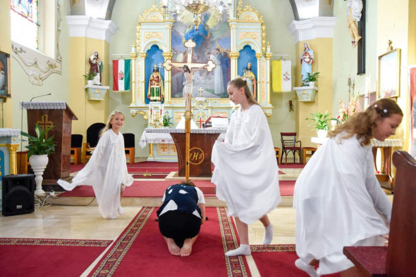 Mindezt az ünnepi szentmisét megelőzően, élő előadásban láthattuk az ajaki fiatalok előadásában. Műsoruk második részében a 2025-ös jubileumi logót keltették életre: négy különböző színbe öltözve a négy égtájról érkező embereket jelenítették meg. Az első, piros ruhás épp a keresztet öleli át a hitet kifejezve megváltó Urunkban, Jézusban, aki lehajol hozzánk és biztonságot ad. A többi egymásba kapaszkodik, amivel mutatják: mindannyian összetartozunk.
