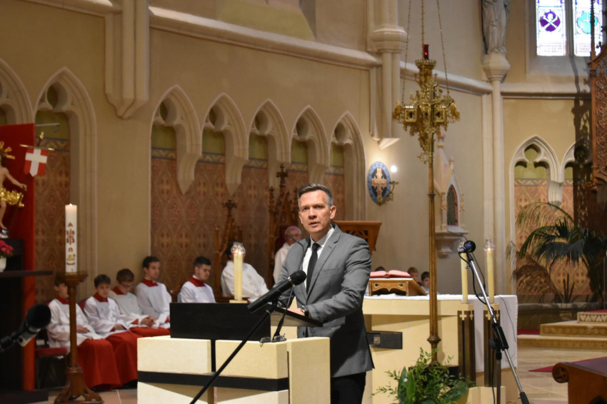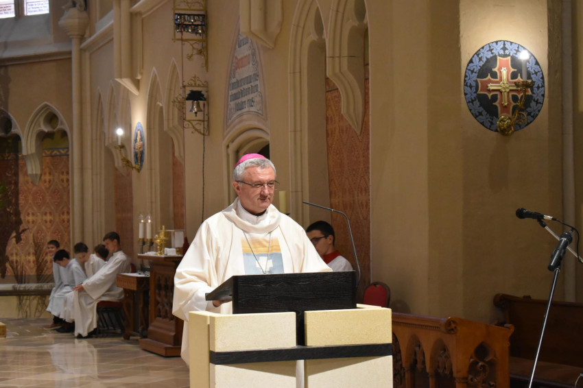 Ha valamit építeni akarunk, elgondolkodunk, mekkora legyen – kezdte szentbeszédét Veres András –, ha nagyot akarunk, erős, mély alapról kell gondoskodnunk. Gondoljunk a bibliai példabeszédre a sziklára és homokra épült házról. Jézus azt ajánlotta, lelki értelemben is így tegyünk:
