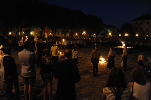 A szertartás után a résztvevők kivonultak a Konstantin térre, ahol fáklyafénnyel, kürtszóval, népdalok éneklése mellett folytatódott az ünnepség. A 2005-ben végzett Nábelek Anita népdalokat énekelt, Sípos Balázs pedig egy 25 éves borkülönlegességgel köszöntötte volt osztályfőnökét, Nemes Györgyöt, majd a diákok egy-egy fontos eseményt idéztek fel az intézmény elmúlt huszonöt tanévéből.