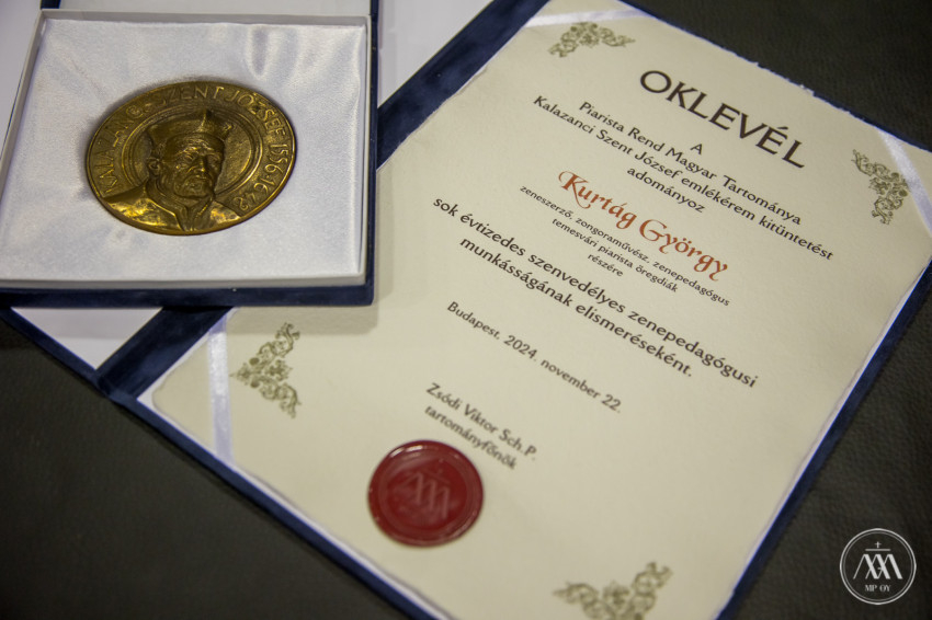 „Köszönjük Kurtág Györgynek, a Temesvári Piarista Gimnázium öregdiákjának, hogy az előbb említett intenzitással és lelkedéssel adja tovább a szépségre megnyíló lelkületet. Hisszük, hogy ez a szépség hozzájárul a világ megmentéséhez. Örömmel, szeretettel adjuk át ma, Szent Cecíliának, a zene védőszentjének ünnepén a Piarista Rend Magyar Tartománya által adományozott Kalazanci Szent József-emlékérmet Kurtág Györgynek sok évtizedes szenvedélyes zenepedagógusi munkásságának elismeréseként” – zárta ünnepi beszédét a tartományfőnök.
