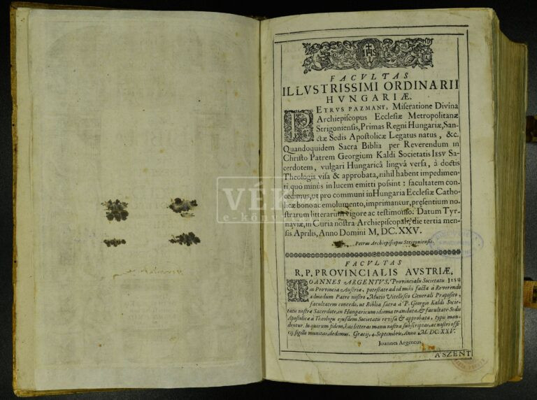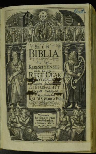A Veszprémi Érseki Könyvtár Káldi György bibliafordításának első kiadásából öt kötetet is őriz. Ezek közül is kiemelkedik a hajdan Hornig Károly püspök tulajdonában lévő dokumentum: a bibliofil püspök a 19. század második felének ismert és elismert könyvgyűjtője volt. Magánkönyvtárának katalogizálásához használt könyvészeti segédkönyvébe – Szabó Károly Régi magyar könyvtár: az 1531–1711. megjelent magyar nyomtatványok könyvészeti kézikönyve – bejegyezte, hogy a Szent Bibliából birtokol egy példányt. A vaknyomásos, disznóbőr kötésű kapcsos Bibliában Hornig püspök pecsétje kétszer is megtalálható. A címoldalon a püspök kézírásával ez olvasható: Cat.