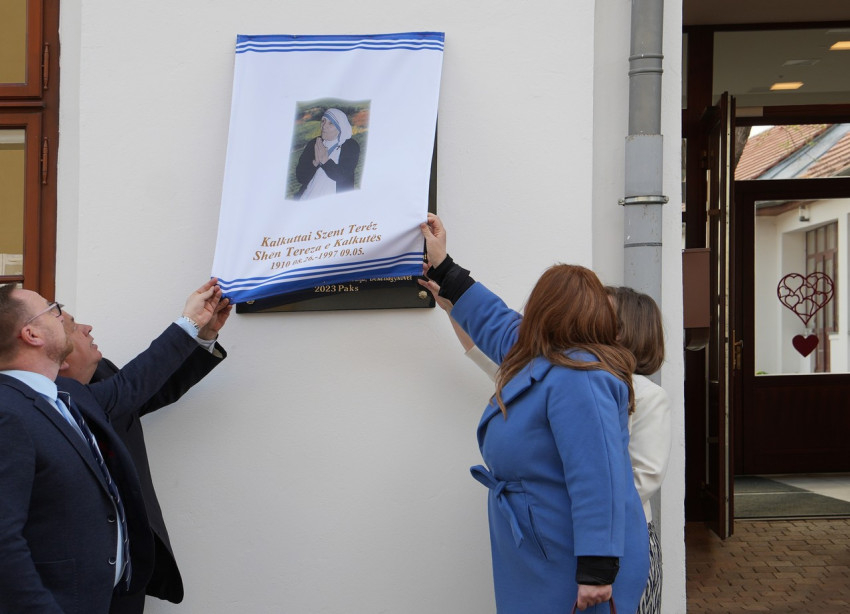 Az óvoda bejárata melletti homlokzaton elhelyezett emléktáblát a szent tisztelete jeléül Hafuzi Avnija, az Albán Köztársaság tiszteletbeli konzulja, a Szent György Lovagrend tagja, békenagykövet állíttatta, melyet a püspöki áldást követően Gentiana Mburimi, az Albán Köztársaság budapesti nagykövetségének ügyvivője; Szabó Péter Paks polgármestere; Hafuzi Avnija, az Albán Köztársaság tiszteletbeli konzulja; valamint Heszné Rauth Ildikó, a Kalkuttai Szent Teréz Óvoda intézményvezetője leplezett le.