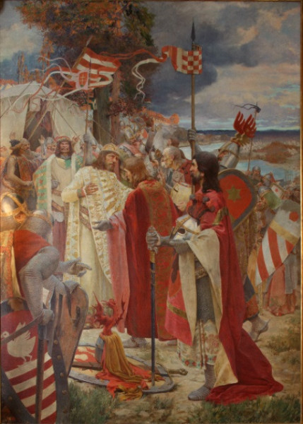 De nézzük, mit kínál látogatóinak a kiállítás. Oton Iveković 1906-ban festett képén A horvát főurak békecsókot váltanak Könyves Kálmánnal címmel örökítette meg a Dráva partján történt eseményt. A kép színes kavalkádjában a király és a nemesek díszes ruháikban pompáznak. A kép a historizmus jegyében készült, és napjainkban a horvát kormány Vallás- és Közoktatásügyi Minisztériumának Aranytermében látható. Cikkünk címében is ezt a jelenetet idézzük fel, hiszen a békecsók ebben az esetben a két nép közötti legszorosabb viszony kifejezője.