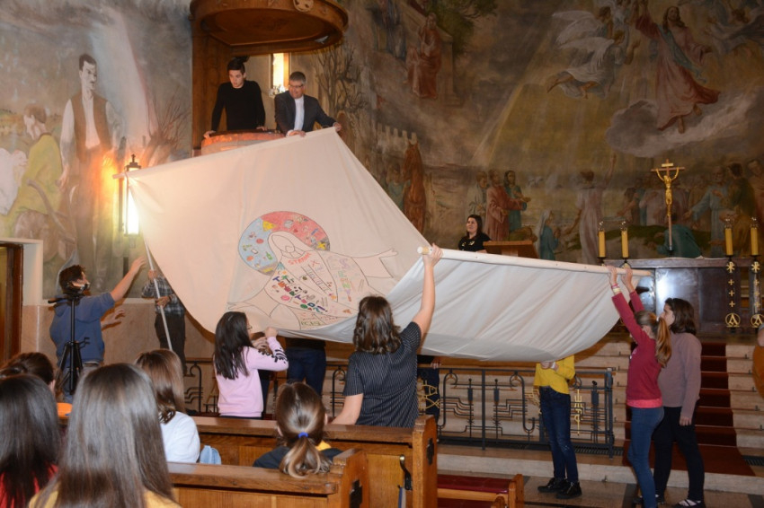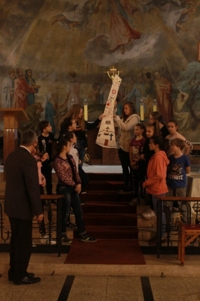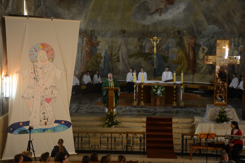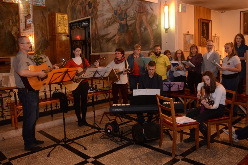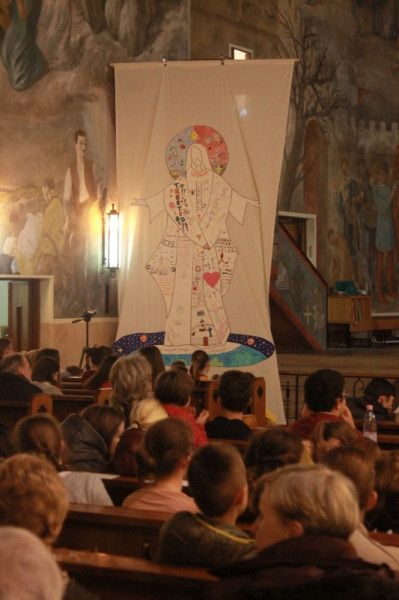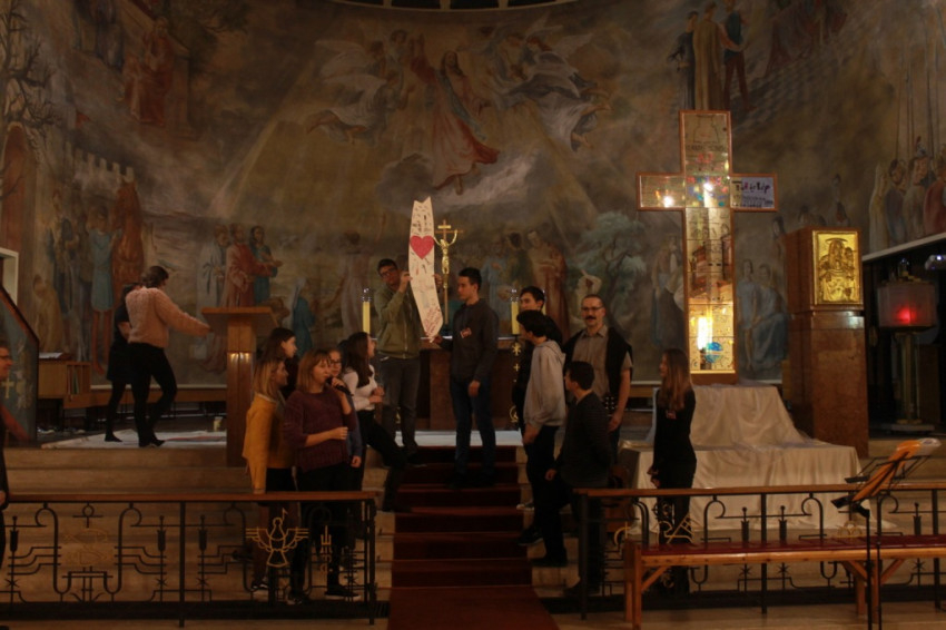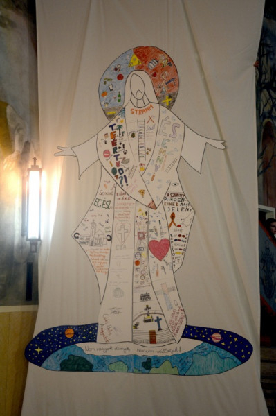 A fórum után Panykó János vezetésével gitáros énekeket gyakoroltak a jelenlévők a 18 órakor kezdődő szentmisére. Amíg énekeltek, a háttérben meglepetés készült: a plakátokat néhány fiatal összeillesztette, és egy hatalmas vászonra rögzítette, amit a szentmise kezdete előtt elhelyeztek a szószéken – a csoportok alkotásai együtt Jézus alakját formálták meg, ezt a résztvevők nagy lelkesedéssel fogadták.