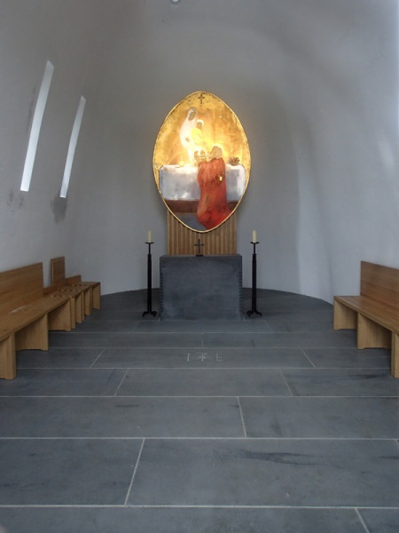 A kápolna fő ékessége a festőművész által alkotott oltárkép, amelyen első királyunk felajánlja országát és koronáját Szűz Máriának.