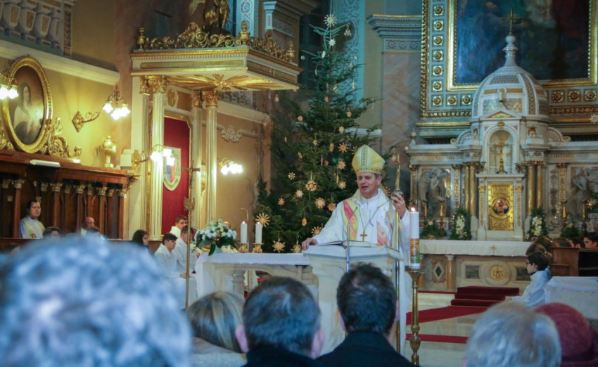 Karácsony ünnepének csúcspontja az ünnepi mise. Szent János evangélista az Úr Jézus örök születéséről beszél, aki már kezdetben volt, Istennél volt; Ő a mennyei Atya kimondott Szava, Igéje, aki által és akiben mindent teremtett; akiben Isten látta, hogy jó minden, amit teremtett. Amikor pedig az ember bűnével elfordult Istentől, aki az élet, a világosság volt számára, és a sötétséget választotta, nem hagyta magára, hanem megtestesült; beleszületett az Istentől elszakadt világba, hogy fényt gyújtson a sötétségben, és visszavezessen minden rabot – a bűn rabságában sínylődő embert – Istenhez, a fényhez, az igazi élethez, még akkor is, ha ez az életébe kerül. … És akik befogadják, hatalmat kapnak az újjászületésre, hogy Isten gyermekei legyenek. Aztán következik Szent János nagy tanúságtétele: „Az Ige testté lett, és közöttünk lakott. Mi pedig láttuk az ő dicsőségét, az Atya Egyszülöttjének dicsőségét, telve kegyelemmel és igazsággal.” – Hol láttad, János apostol, Isten dicsőségét? – Láttuk a kereszten meghalni, és harmadnapra feltámadni. Dicsőséges sebhelyei nem tűntek el a megdicsőült testéről, hanem ezek lettek azonosítójegyei. Teljessé tette megváltásunkat, és megmutatta, hogy szeretet az Isten, aki nem tud visszaütni, csak kitárt karral átölelni.
