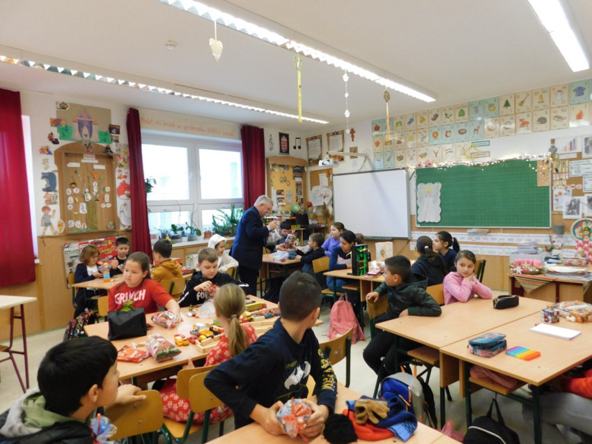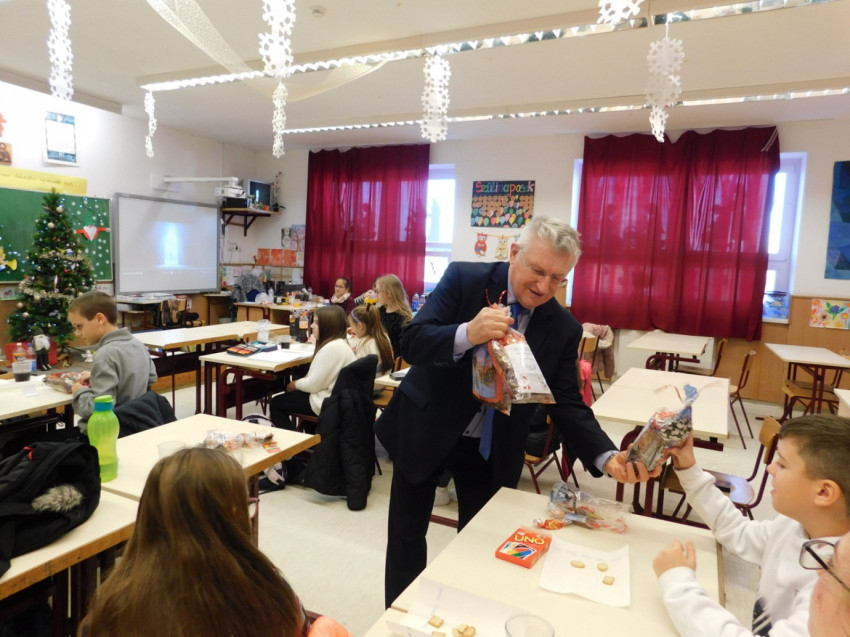 Reggel fél 9-től városunk polgármestere, Hovánszki György polgármester érkezett hozzánk és osztályról osztályra járva szétosztotta a gyerekeknek szánt ajándék mikuláscsomagját. Minden tanuló – 317 fő – örülhetett a tartalmas finomságokkal tele csomagnak függetlenül attól, hogy Nyírlugoson lakik, vagy a szomszéd települések valamelyikéről jár be hozzánk.