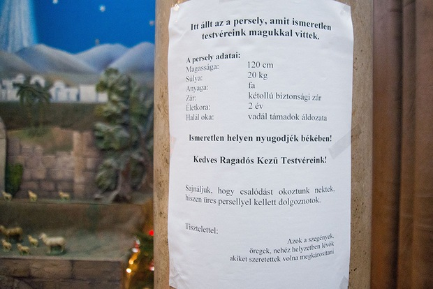 – A fél egyes mise után kiürítettük a perselyt, így a tolvajok üres kézzel távoztak. Munkatársaim a délutáni mise kezdetekor már csak a szekrény hűlt helyét találták – mondta Kondé Lajos. A plébános a persely egykori helye mögötti oszlopra egy feliratot ragasztott ki, amiben a pénztartó főbb paraméterei mellett a tolvajokat is megszólította. „Kedves ragadós kezű testvéreink! Sajnáljuk, hogy csalódást okoztunk nektek, hiszen üres persellyel kellett dolgoznotok" – olvasható a papíron.