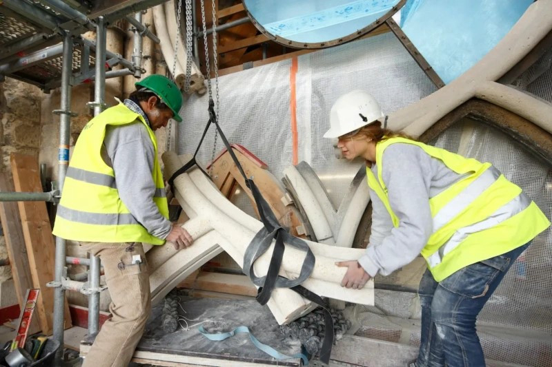 Rengeteg különleges szakma képviselői dolgoznak ezen az építkezésen. Az idézett honlapon tizenötöt mutatnak be közülük, köztük olyanokat, akik az előzetes tudományos kutatásban vettek részt, mint a régészek, vagy a nagy épületelemek újjáalkotásában: ácsok, kőművesek, kőfaragók, ipari alpinisták, rézművesek, állványépítők és a művészek, akik a kisebb művészi díszítőelemeket készítik el: üvegművesek, különfajta restaurátorok, akik a fém- és kőszobrokat, freskókat teremtik újjá.
