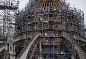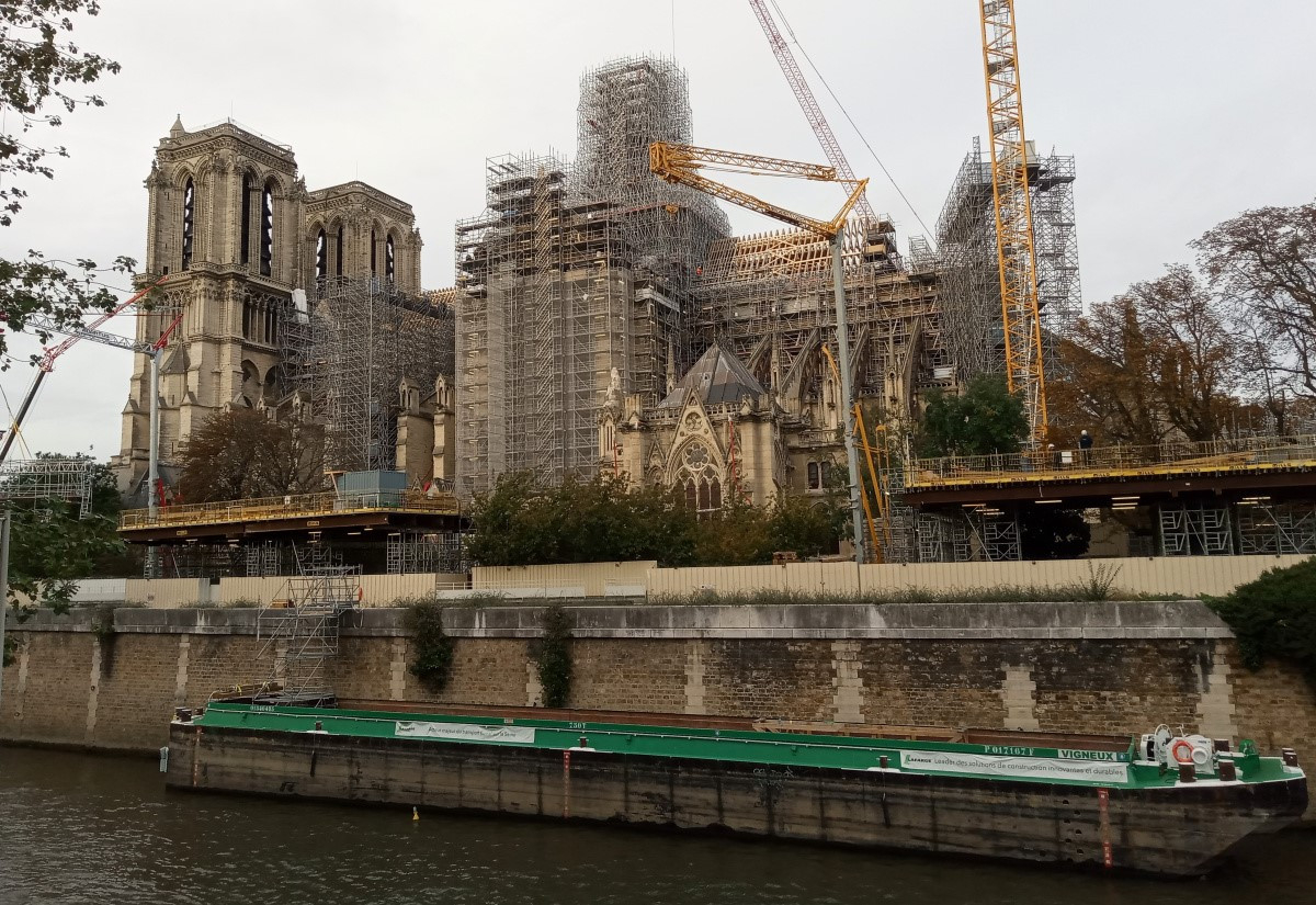 […] Számtalan kisfilm, interjú, magyarázó cikk segíti az érdeklődőt, hogy megértse, milyen összetett folyamat a sokak szerint az évszázad legnagyobb műemléki restaurálása. Sőt, a katedrális előtti tér alatt ingyenes kiállítás várja az érdeklődőket, ahol folyamatosan követhetők a munkálatok, bemutatják az újjáépítésen dolgozó szakmákat és képviselőiket. Olyan tárgyak is ki vannak állítva, melyek vagy arra várnak, hogy visszakerüljenek a helyükre – mint például két, Viollet-le-Duc (a 19. századi felújítás műtörténésze és a 2019-es tűzvészben megsemmisült huszártorony tervezője – a szerk.) által tervezett színes üvegablak –, vagy már nem fognak visszakerülni, de valamennyire megmaradtak a tűzvész után. Például a huszártorony alatti keresztboltozat zárókövét díszítő négy kőangyalfej egyike, mely 35 métert zuhant, és jelentős károsodást szenvedett. Ezt a szobordíszt és a másik három ugyanilyet már újrafaragták a kőfaragók, jelenleg az aranyozásuk zajlik. Szintén látható az a formátlan ólomtömb, amivé a huszártorony csúcsát fedő ólomsisak és az azt övező gyönyörű ólomdíszítések váltak a tűzben. Ezeket a tetőfedő-díszítő kézműves szakemberek alkotják újra az eredeti tervek alapján.