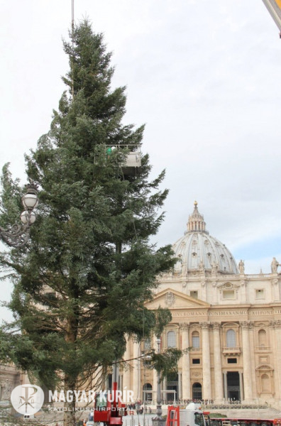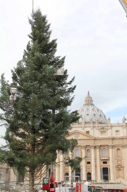 A dél-olaszországi Calabriából származő fenyő díszítése a napokban folytatódik majd, és végül az égőket is elhelyezik az óriási karácsonyfán. A Catanzaro önkormányzata által ajándékozott jegenyefenyő 25,5 méter magas, 55 cm széles törzsű és 80 mázsa súlyú. A Passo dell’Abate helységből való fát úgy vágták ki, hogy ne okozzon kárt az erdőben, ahol növekedett. A műveletet a Zöld Calabria elnevezésű regionális ügynökség csapata végezte. A fenyőt helikopterrel szállították le a hegyről, majd teherautón érkezett Rómába.