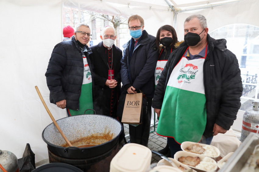 A jelen lévő szegények, köztük sok hajléktalan és néhány menekült család, személyesen vehették át a névre szólóan összeállított ajándékcsomagot, meleg ételt. Ez utóbbit ismét a Kapuvári Ízvadászok főzték a helyszínen, hogy friss és meleg legyen – ők nemcsak kiváló szakácsok, hanem nagyszerű barátok is.