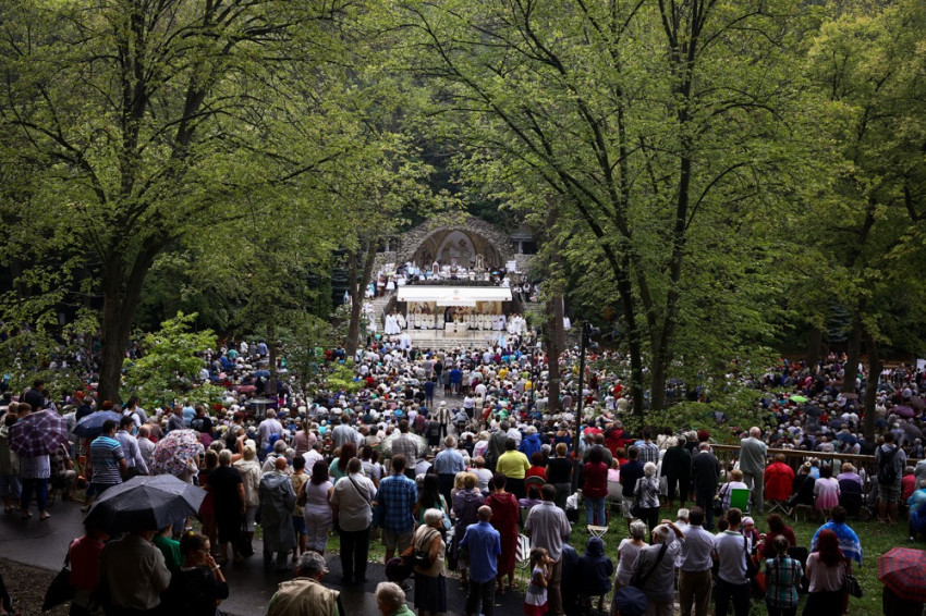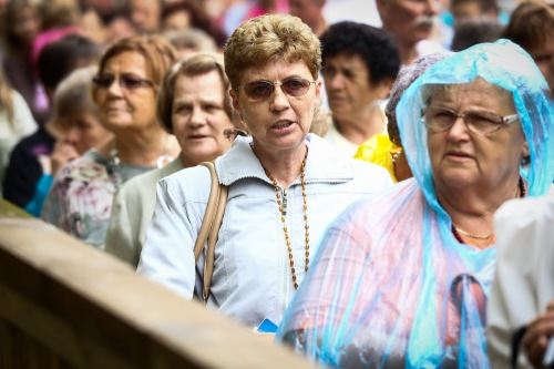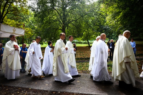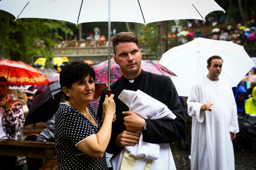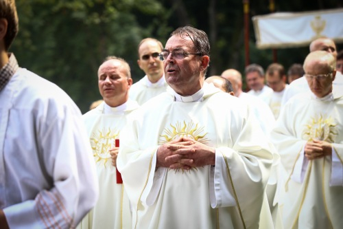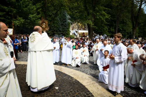 A sűrűn zuhogó esőben kezdődő ünnepi liturgia a Mária-szobrok hordozóinak bevonulásával indult. A szentmisét latinul mutatta be Kazimierz Nycz bíboros az ünnepen megjelent számos paptestvérrel.