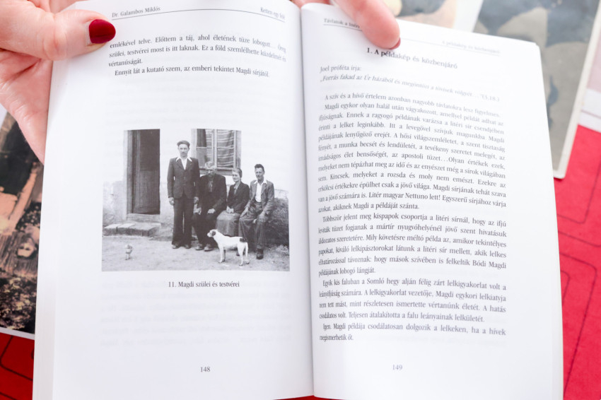 Szabó János balatonalmádi plébánostól tudtam meg, hogy a vörösberényi templomban van Goretti Mária-ereklye. Csoda, hogy a két lány ilyen közel került egymáshoz a halála után. Galambos apát úr könyvét 1956-ban adták ki, de persze nem nyomtatásban, mert akkor ilyesmiről szó sem lehetett. Írógépen írták, úgy van összefűzve. Össze is szedtek több példányt, eltüzelték őket, de egyet rejtegetett az édesanyám. Amikor férjhez mentem, odaadta nekem, úgy eldugtam, hogy még a férjem sem tudott róla, egészen addig, míg Temesi József ki nem adatta a Tanúságtétel liliommal, vérrel című könyvét a kilencvenes évek végén. Temesi atya aktualizálta Galambos apát egykori könyvét, kiegészítette a család történetével. Még rólam is írt benne, hogy Marika már iskolás… A könyv elején volt egy kis ismertető, amelyben Temesi atya kérte, hogy ha valaki tud Magdiról, keresse meg. Írtam neki, hogy nálam van Galambos Miklós apát könyve, és szeretném meglátogatni a leányfalusi papi otthonban. Visszajött a levelem azzal, hogy Temesi atya időközben meghalt.