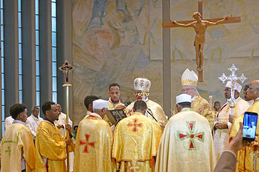 Hogy a Szent Hedvig-egyházközség tagjai és a távolabbról érkezett hívek is követni tudják a liturgiát, a szertartás egyes részeit német nyelvre fordították, és a pappá szentelés is németül zajlott. Dobokkal és énekléssel közreműködött az eritreai közösség kórusa, ünnepélyessé és élettel telivé téve a közel háromórás ceremóniát. (A Kidane Mehret közösséghez számos fiatal és gyermek tartozik, ennek is köszönhető, hogy a szentelési szertartás rendkívül eleven volt, ami a német híveknek is örömére szolgált.) Amikor Kidane Yibio püspök pappá szentelte Medhanie Ugbamichael Yohannest, az eritreai hívek hangos tapsa és a nők jellegzetes trillázása – mely sajátos vonása az eritreai istentiszteleteknek – töltötte be a templomot.
