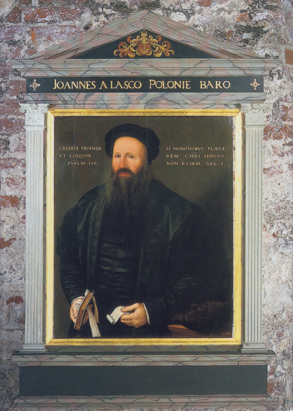 Jan Łaski, a templomból lett egyházi könyvtár és multifunkcionális művelődési központ névadója 1523-ban, Baselben ismerkedett meg a reformátori eszmékkel, s itt nyerte el Erasmus és Zwingli barátságát. 1542-től az emdeni eklézsia lelkészeként szolgált, majd nyolc évvel később a protestáns egységet képviselő londoni „Idegenek temploma” prédikátora és lelkigondozója lett. Soknyelvű, sokfelől érkezett emberekből verbuválódó gyülekezetét VI. Edward, az ifjú király rövid uralma idején szeretettel és hatékonyan tudta szolgálni. Mindennek 1553. július 23-án, Véres Mária trónra lépésekor lett vége; ekkor Łaski vezetésével a londoni „nemzetközi” gyülekezet egy része hajóval Koppenhágába menekült, az Augsburgi hitvallás megtagadása miatt azonban innen Brandenburgba távoztak. 1556-ban Jan nagytiszteletű urat visszahívták Lengyelországba, ahol II. Zsigmond király titkára és a lengyel kálvinizmus vezető alakja lett. Az emdeni könyvtárban látható lelkipásztorportrék sorában az őt – mint névadót – ábrázoló festmény kitüntetett helyet kapott. A kép bal oldalán a 116. zsoltár alábbi sora olvasható, latinul: „Hittem, azért szóltam” (Károli-Biblia, 1908). Jobb oldalán pedig a Galáciabeliekhez írt levél kiemelt kulcsmondata: „Bizonyára, ha még embereknek igyekezném tetszeni, Krisztus szolgája nem volnék” (Károli-Biblia, 1908).