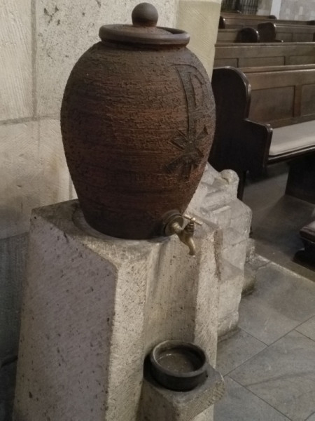 A galamb elmondta a lánynak, hogy menjen a templom másik felére, és ott a nagy ajtóknál van a szenteltvíztartó korsó. Abból hozhat vizet. És ahhoz, hogy a doboz kinyílhasson, kell a kulcs, amelyet Pétertől kapott. Veroni elővette a kulcsot, és óvatosan elfordította a zárban. Az aranydoboz kinyílt, és tényleg sok tál volt benne. Veroni gyorsan kiszámolta, hány állat kért vizet, és végül is hat tányért vitt magával a kőkorsóhoz, ami egy kicsi hordóra hasonlított. Egy csap volt az oldalán, azon folyhatott ki a víz. Amikor Veroni meglátta, csodálkozott, mert ő a szenteltvíztartót szép díszesnek képzelte. Elfordította a kis csapot, és vizet engedett az edényekbe. Az első két edényt a halnak és a szamárnak vitte.