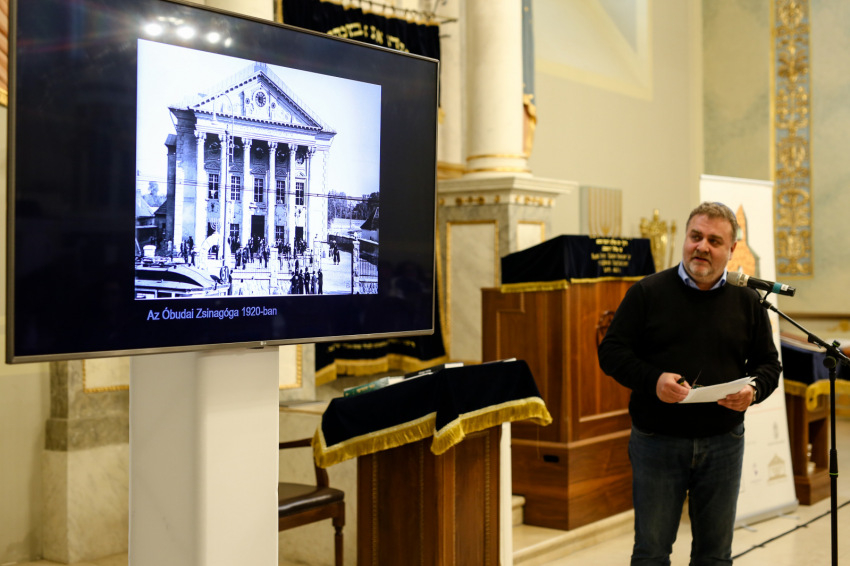 A következő előadó Szécsi Zsolt volt, aki az óbudai zsinagóga történetét mutatta be a hallgatóságnak; előtte Bábel Balázst szólította meg, megemlítve, hogy 15 évvel ezelőtt az érsek írt ajánlást Major Balázzsal közös, Szíria építészetéről szóló kötetükhöz. A török után se Buda, se Pest nem engedte zsidók betelepedését, így kerültek az akkor még mezőváros Óbudára, a Zichy család birtokaira. A ma álló, külsejét tekintve klasszicista épület a harmadik zsinagóga ezen a helyen; 1821-ben készült el, s mérete vetekedett a hírneves amszterdami zsinagóga méreteivel. Bár nem Pollack Mihály nyerte a pályázatot, hanem Andreas Landherr, érzékelhetően Pollack terveit is beledolgozták az új épületbe. A 2. világháború után amúgy is rossz állapotban lévő imaházat tovább károsította az akkortájt rákerülő cserépfedés (az eredeti rézfedést hadi célokra használták fel), melynek súlya miatt repedések keletkeztek a falban. Elindult a „használaton kívüliség eróziója”. Amikor a Magyar Televízióhoz került az épület, az örökségvédelmesek kikötötték, hogy vigyázzanak például a díszítő festésekre, ami azonban nem nagyon sikerült: ma rekonstruktív festésekben gyönyörködhetünk.