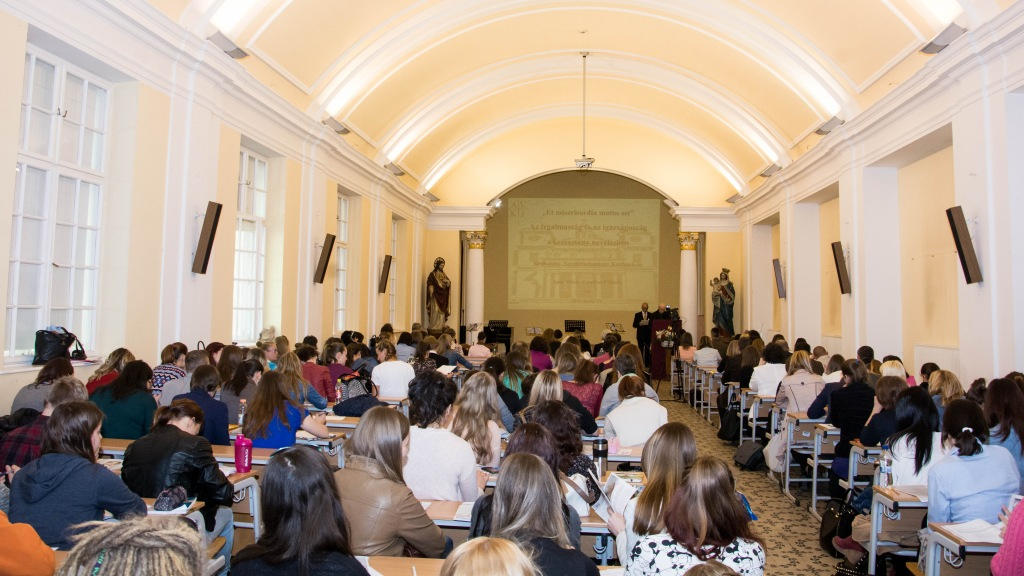 Fülöpné Erdő Mária, a főiskola rektora Az irgalmas és igazságos nevelés társadalmi dimenziói címmel tartott plenáris előadást. Kiemelte az egyházi iskolarendszer lehetőségeit és felelősségét az irgalmasság cselekedeteinek gyakorlásában. Hangsúlyozta, hogy a nevelés igazságossága abban jut kifejezésre, hogy mentes a személyválogatástól, minden növendékkel teljes odafigyeléssel és egyforma odaadással foglalkozik. Rámutatott a keresztény nevelés társadalmat és közgondolkodást formáló jelentőségére is.