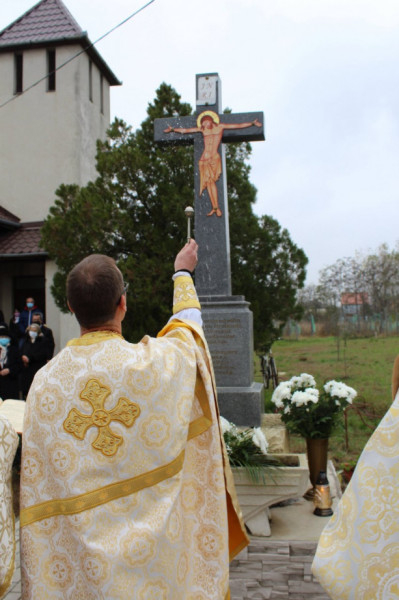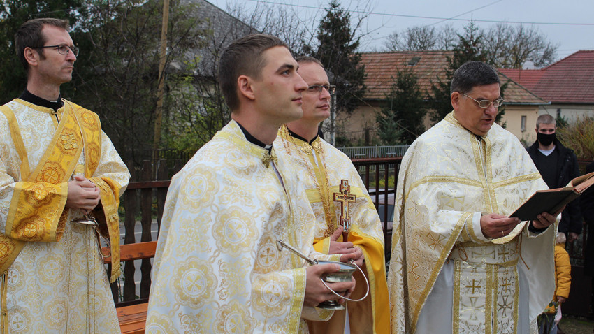A Szent Liturgia végén a kereszt előtt folytattuk a szertartást, ahol először a szentelést végeztük el, majd elénekeltük közösen azt az imádságot, mely a keresztünkön is látható: „A te kereszted előtt leborulunk, Uralkodónk, és a te szent föltámadásodat dicsőítjük!”