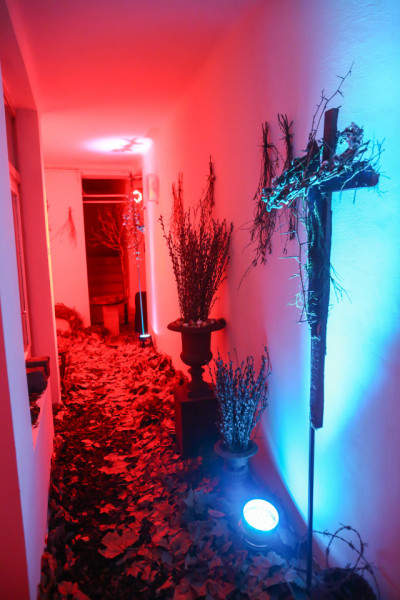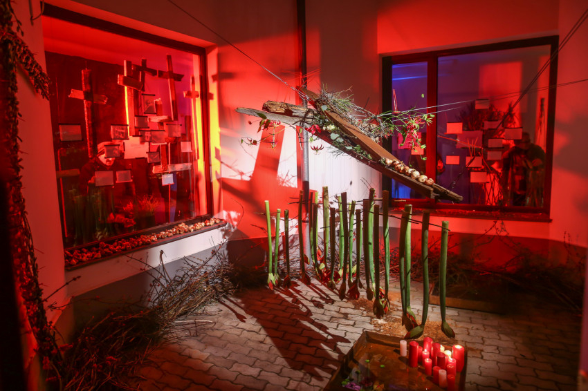 Különleges térré változott a plébánia belső udvara, a szenvedés és a halál titka tárul fel a fájdalommal teli kompozíciókban. Mintha a Golgota hegyére jutottunk volna: a lábunk alatt száraz falevelek, mellettünk vaskeresztek, fakeresztek, rózsaszirom-vérrel befröcskölt keresztek, a három golgotai kereszt drótoktól összetartott üvegszilánkokból álló „töviskoszorúval”, vörös fényben… A keménység, ridegség érzését fokozzák a fotók, korunk emberének mérhetetlen szenvedéseit tárva a szemünk elé. A látogató tekintetét az udvar közepén függő hatalmas kereszt látványa vonzza magához, és ha kilép az udvarba, mintha egy töviskoszorú közepébe kerülne, onnan szemléli a nagy fakeresztet, amely alatt vörös amarilliszek formálnak szintén kereszt alakot, a kiömlő vért szimbolizálva.