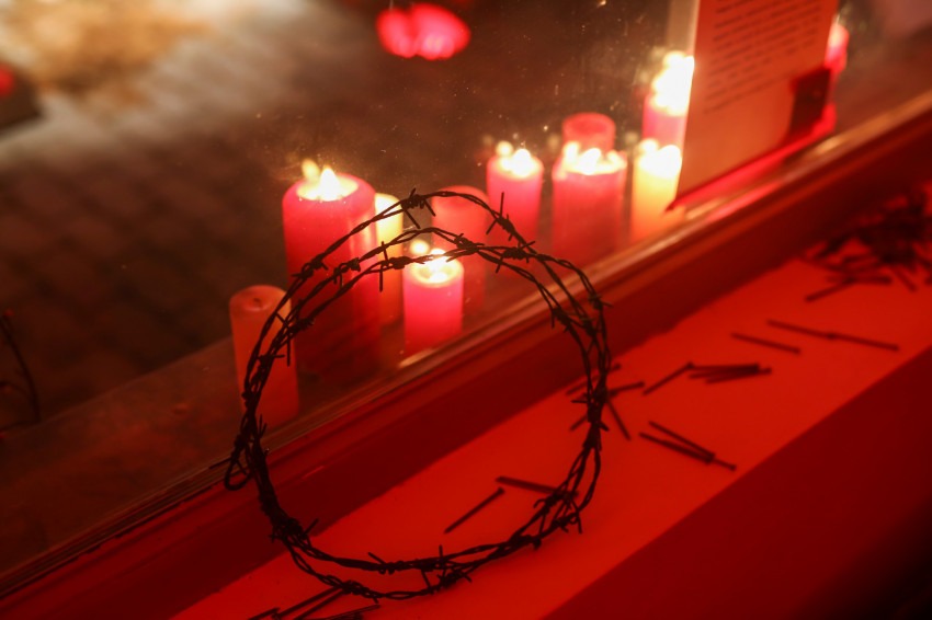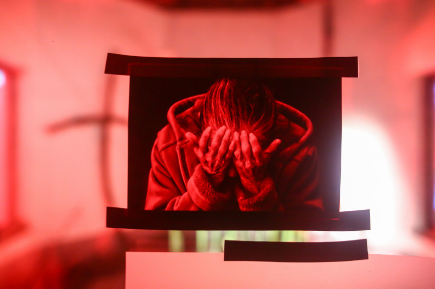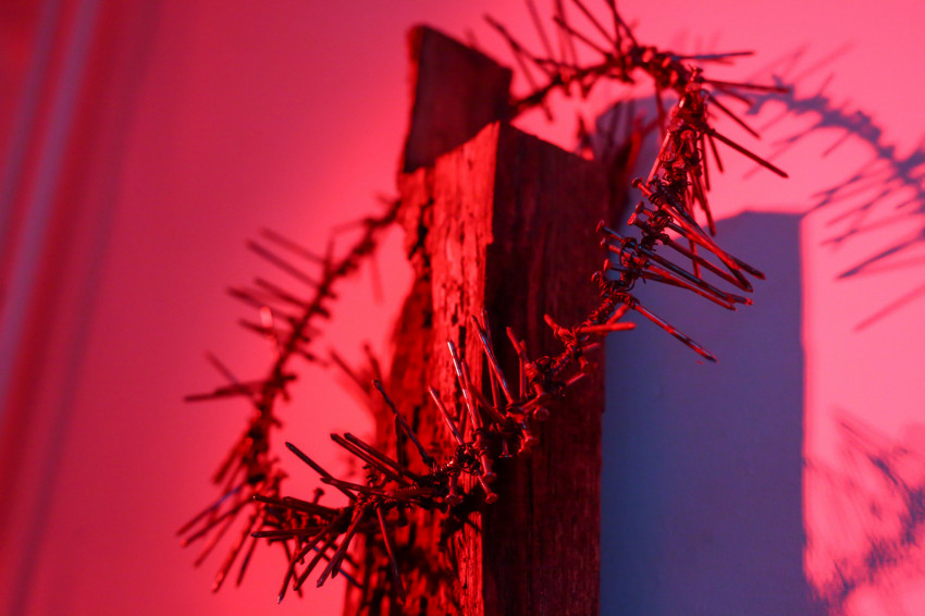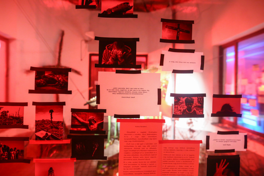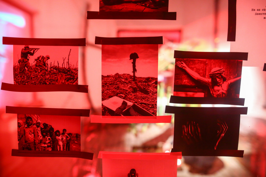 Amikor belépünk, a fájdalmat kifejező fotók fogadnak, a világ fájdalmai, hogy érezzük ezeket a kereszteket, töviskoszorúkat. Érezzük, mennyi fájdalom van a világban: a kereszt szegei, a világ keserűségei, a betegségek, járványok, az elhagyottak, a háborúban szenvedők fájdalma, de a sok viszálykodás is mind egy-egy seb.