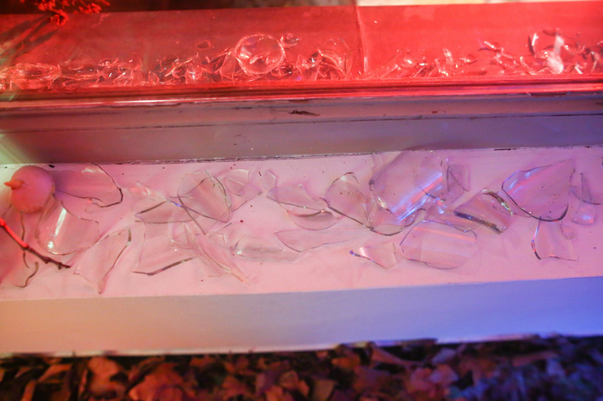 Tárlatvezetéssel folytatja az alkotó: a kerengőben üvegszilánkok, vasdarabok, fém és természetes anyagok egyvelegével indul az utunk, és ahogy elindulunk körbe, észrevesszük, hogy a megmunkált dolgok és a természet érintetlen elemei egységet alkotnak. A kör végén állnak a keresztek az üvegszilánkokból álló koszorúkkal, szinte fizikai fájdalmat érzünk a láttukra.